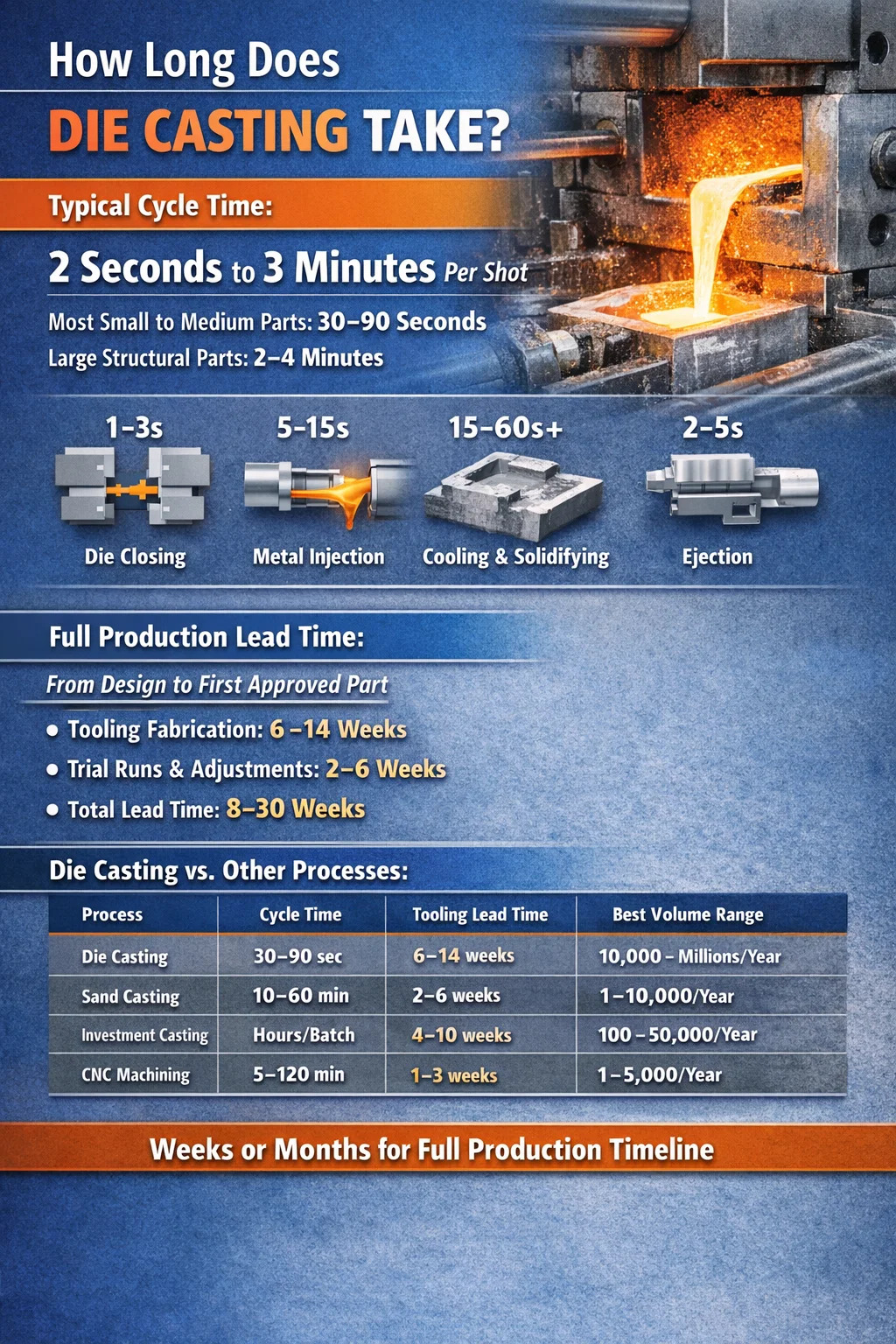 Một chu kỳ đúc khuôn duy nhất thường mất khoảng từ 2 giây đến 3 phút , tùy thuộc vào kích thước bộ phận, loại hợp kim, độ dày thành và cấu hình máy. Đối với hầu hết các thành phần nhôm hoặc kẽm vừa và nhỏ — loại được sử dụng trong khung, vỏ ô tô và thiết bị điện tử tiêu dùng — thời gian chu kỳ thực tế nằm trong khoảng 30 và 90 giây . Các bộ phận cấu trúc bằng magiê hoặc nhôm lớn dành cho xe điện có thể đẩy thời lượng đó lên 2–4 phút mỗi lần chụp.