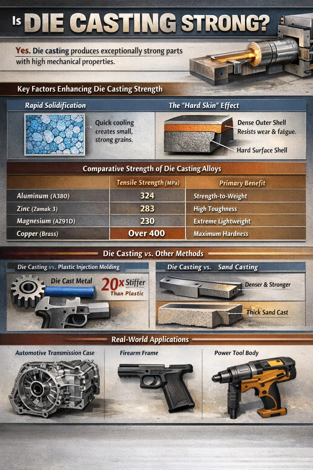 Vâng, đúc chết sản xuất các bộ phận đặc biệt chắc chắn, thường vượt quá độ bền của ép phun nhựa và sánh ngang với tính toàn vẹn cấu trúc của một số bộ phận rèn. Bởi vì quá trình này liên quan đến việc ép kim loại nóng chảy vào khuôn dưới áp suất cao , cấu trúc kim loại thu được dày đặc và mịn, giúp tăng cường đáng kể các đặc tính cơ học của nó.