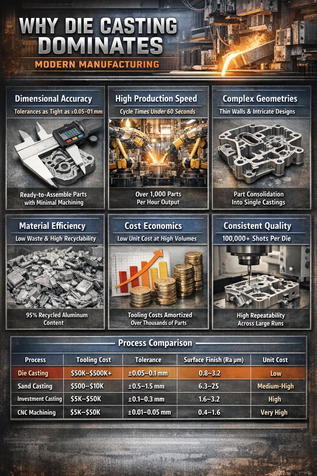 Bảng minh họa vị trí phù hợp của phương pháp đúc khuôn: đây không phải là lựa chọn rẻ nhất cho khối lượng thấp và không phù hợp với gia công CNC để có độ chính xác cao nhất. Nhưng để sản xuất khối lượng từ trung bình đến cao các bộ phận phức tạp đòi hỏi độ chính xác tốt, bề mặt nhẵn và chi phí trên mỗi đơn vị thấp, nó chiếm một vị trí mà không quy trình nào khác có thể thay thế hoàn toàn.