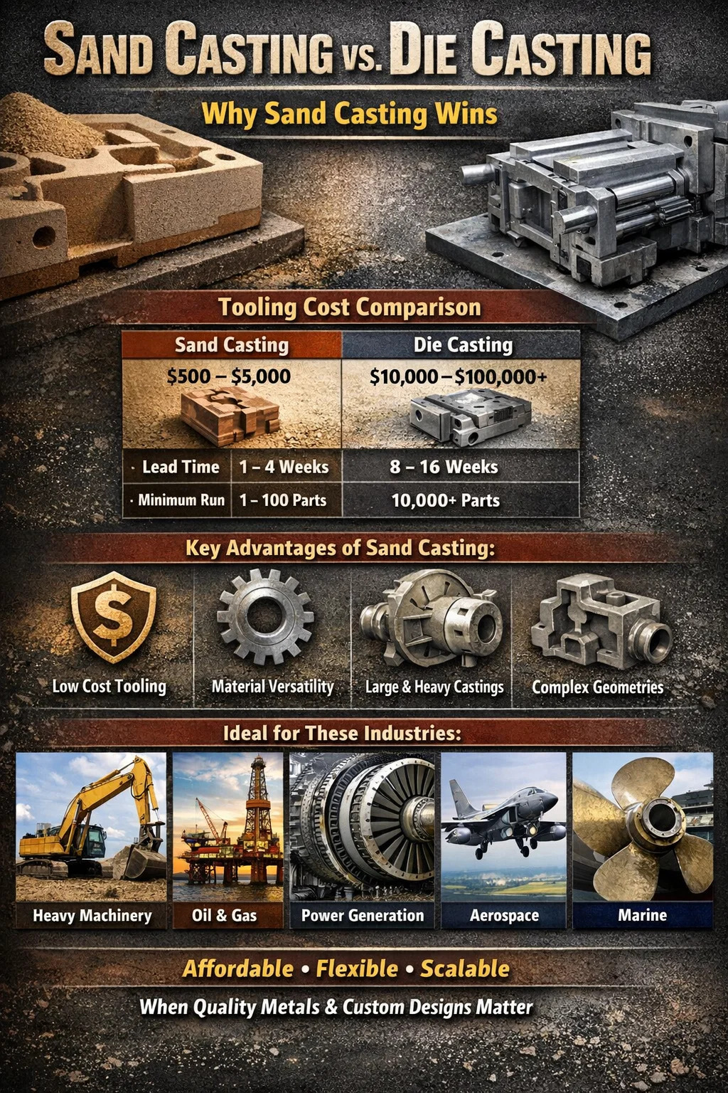 Câu trả lời ngắn gọn: Đúc cát thắng về chi phí, tính linh hoạt và quy mô